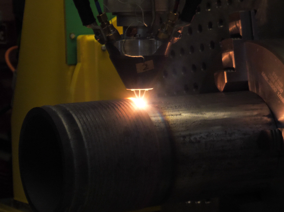 The modular design of the processing optics from the OTS and OTZ series makes it possible to convert from a powder coating process to a cladding process with wire in the field. The powder nozzle can be dismantled and – via plug-&-play – converted to, for example, a MultiWire processing optic. Once the system configuration and process have been adapted, cladding can then be carried out with MultiWire.