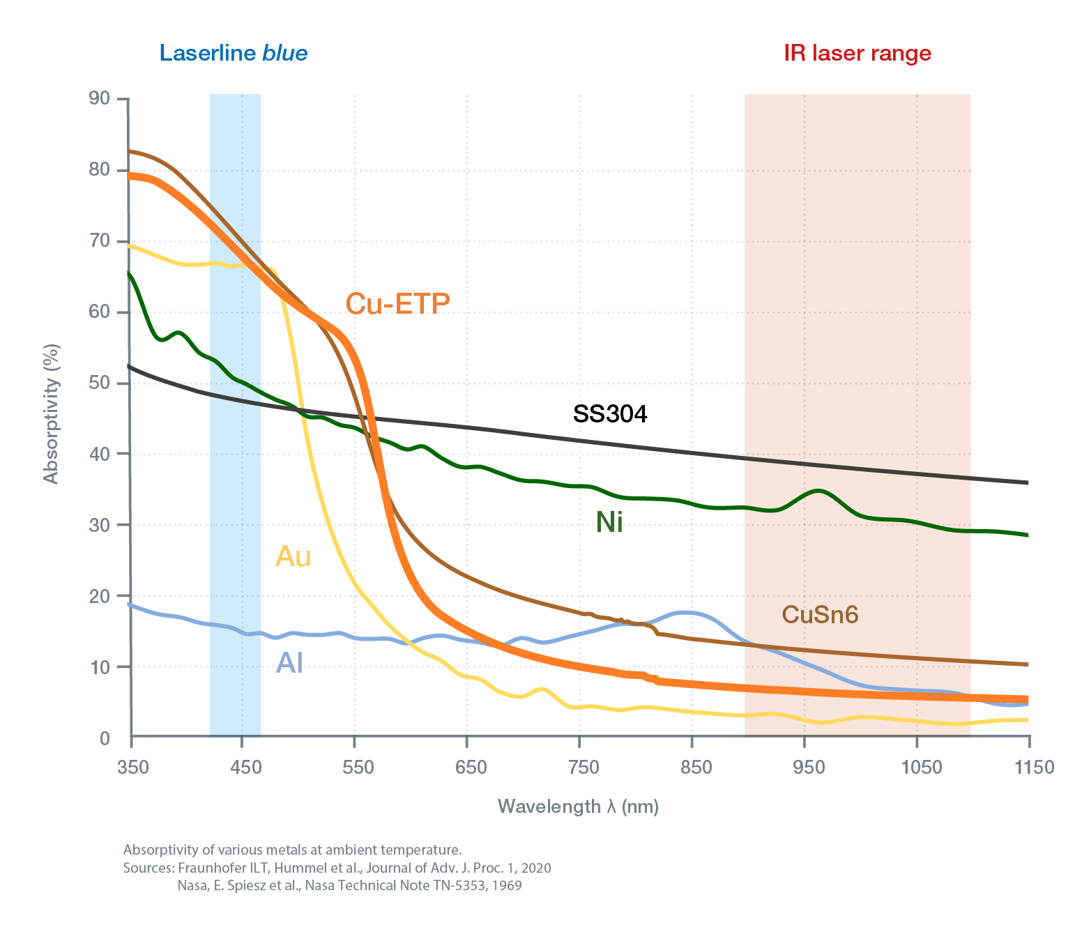 With industrial laser beam sources available to date, it was only possible to process non-ferrous metals such as copper successfully in series production with increased effort. Thanks to recent advances in laser technology, particularly the development of high-power blue diode lasers, laser welding of copper and gold has become significantly more efficient and reliable. These materials absorb the blue light spectrum seven to twenty times better than infrared light (see graphic), which dramatically improves energy coupling and melt behavior in the infrared range.