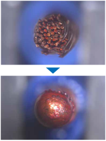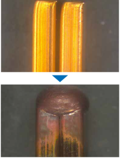 - Welding of three copper contacts on the flattened side of the pins (Pin through sheet)